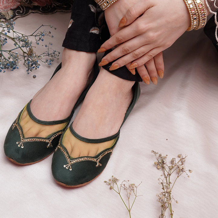 Araaish features a beautiful velvet base with an exquisite scallops design. The tilla, moti, and sitara details add a touch of elegance, while the sheer scallop detailing adds a unique touch. Versatile and stylish, this jutti is a perfect fit for any outfit.